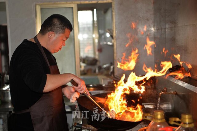 “王二娃土菜馆”经营者王强正在为来自川渝两地的客人炒菜