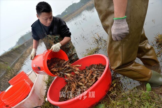 虾农将捕获的稻虾运上岸
