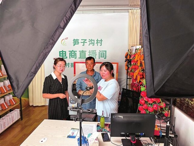在浙川协作推动下,阿里巴巴(苍溪)客户体验中心入驻广元市苍溪县,该县电商直播产业从无到有、逐步壮大,县域经济迎来“云端”新引擎。图为在苍溪县陵江镇笋子沟村电商直播间,村支部书记张桂华和村民一起直播。 新华社发(王韬 摄)