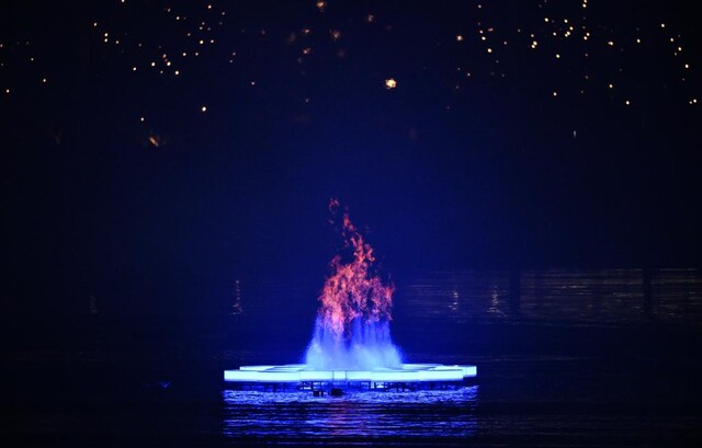 摩托艇靠近,点火——喷泉顶端,圣火熊熊燃起。