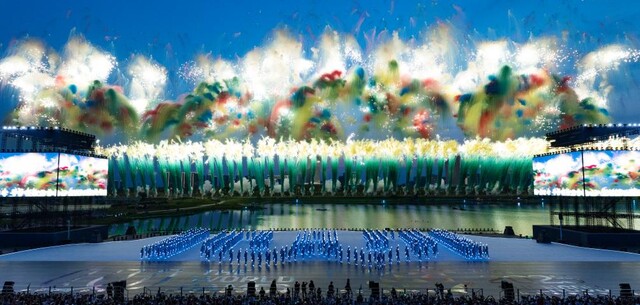 8月7日拍摄的开幕式上的焰火表演。新华社记者 陈益宸 摄