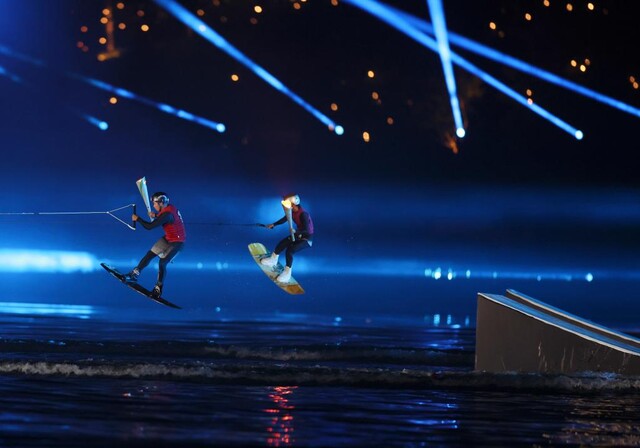 开幕式接近尾声,中国滑水运动员以滑水的方式疾驰于湖上,共同点燃主火炬,水火交相辉映,现场再次沸腾。