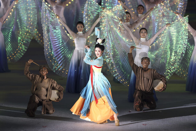 开幕式文艺演出中的大型中国舞组舞表演,由“鼓、乐、诗、花”四个段落构成。“鼓”寓意昂扬,“乐”寓意热情,“诗”寓意温雅,“花”寓意开放。表演中涵盖金沙太阳神鸟、说唱俑、二十四伎乐、川剧变脸等传统文化元素。其中,太阳神鸟金饰是古蜀先民的重要精神标识,太阳神鸟金饰图案也是古蜀文明和天府文化的象征,是成都的城市形象标识;出土于成都的东汉击鼓说唱陶俑,展现的是来自2000多年前的俳优表演说唱,富有浓厚民间气息和地方风貌,反映了古代四川人乐观幽默的地域文化特质;千年绝艺川剧变脸,于瞬息之间展现内心百态,被誉为“中华瑰宝,国之精粹”,也是巴蜀儿女献给世界的锦绣之韵。