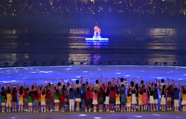 夜色中,两艘快艇划过湖面,滑水运动员手持火炬,快速经过水柱形成的主火炬——世界运动会历史上第一支主火炬被点燃,主火炬的光芒跨越山海,向全世界传递梦想之光。主火炬点亮的夜幕之中,焰火如浪潮般气势磅礴、源源不断地喷薄而出,火炬、焰火与湖水中的倒影水火交融、交相辉映,共绘一片璀璨华光。
