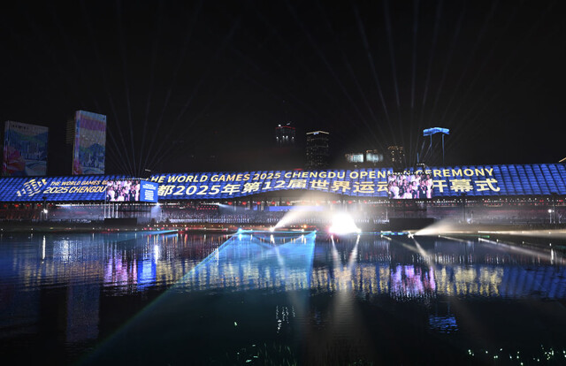 观众席上,数字化屋顶成为大屏幕,既可投射缤纷城市景象,也可在运动员入场时展示国际世界运动会协会、各单项协会会徽,以及世界运动会比赛项目图标和运动员笑脸,充分展现出运动的自信与生命的活力。数字光影此刻与湖泊交相辉映,配合湖畔和远处楼体的灯光秀,形成美轮美奂的色彩盛宴,彰显缤纷万千的成都魅力。
