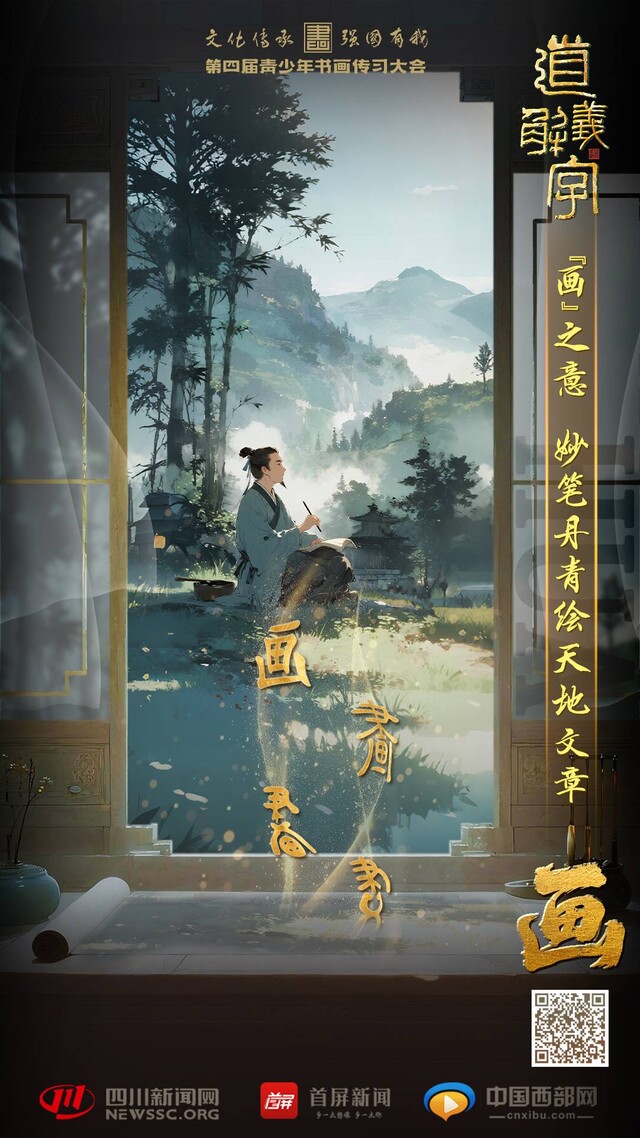 “画”字是会意字,最早的“画”字见于商代甲骨文,从聿从交叉的“圆规”形,像手持笔以规画的样子。到西周时,交叉的“圆规”被田地形的“周”字取代,描绘用手划分地界的情景。秦汉时,小篆“画”字在偏旁“田”的字形上加四个代表边界的笔画,字形基本统一,隶书和楷书承袭此形态。现代简化字“画”,是用田加四界这个字形的局部代替整体。《说文》说:畫,是划分田地的四界;聿,所以画之。画者,状物之形,写意之道。