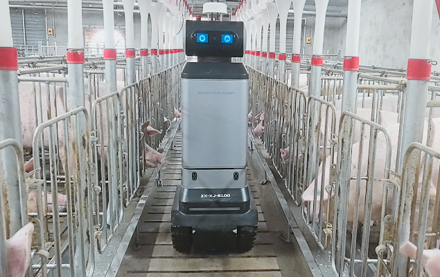 头顶上,白色滑轨机器人正静静移动,搭载的高清摄像头实时捕捉每头猪的活动轨迹;地面上,履带机器人如贴心护士穿梭其间,借助红外热成像与视觉识别,实现精准的“猪脸识别”。它们24小时在岗,悄然记录着“猪妈妈”和“猪宝宝”的声音、体温、进食行为。一旦发现某头猪采食减少或体温异常,瞬间触发预警。工作人员会立即进行核酸检测,将风险控制在萌芽状态。