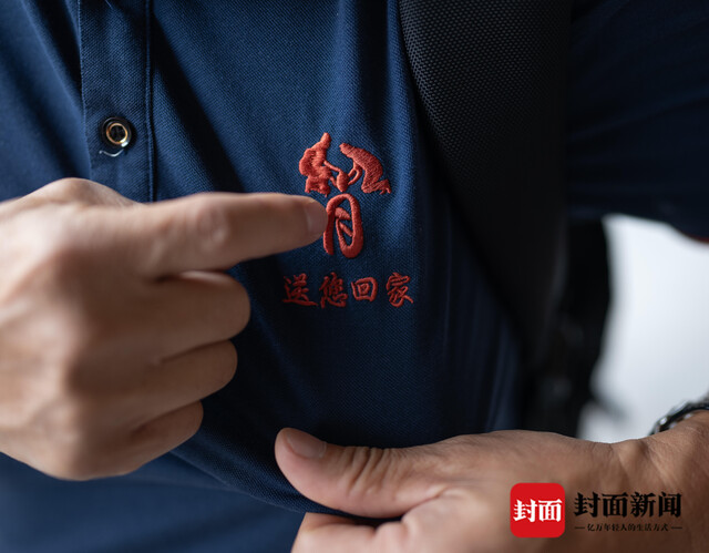 刘德文向记者展示他衣服上的logo,那是他女儿设计的一个“背”字.