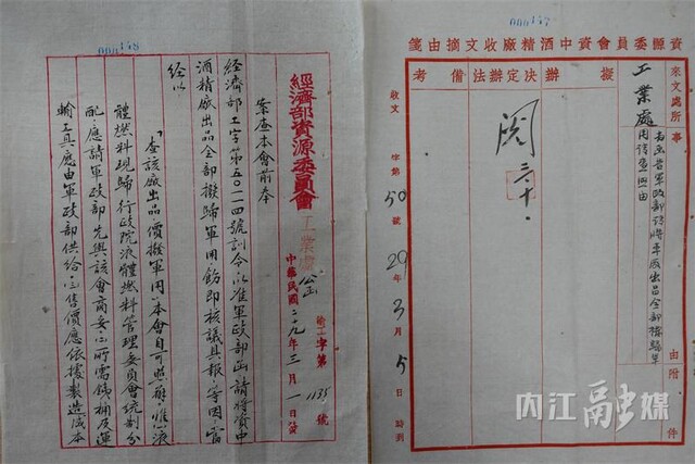 1938年,四川省政府与经济部资源委员会在椑木镇合办四川酒精厂,这是大后方第一家酒精厂。此后,内江酒精产业迅速发展,截至1941年底,全川81家酒精厂中,资中独占28家。档案中的一份份指令与报表,见证了内江酒精的重要价值:1940年3月,经济部资源委员会函令“资中酒精厂出品全部拨归军用”;1940年4月,液体燃料管理委员会会议记录显示,四川14家酒精厂需为航委会、兵工署等9个单位供应25.85万加仑酒精;1942年6月,更明确“四川无水酒精全由航空委员会承购”。