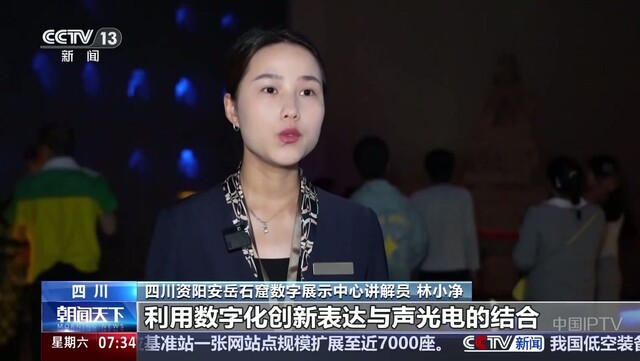 四川资阳安岳石窟数字展示中心讲解员 林小净:利用数字化创新表达与声光电的结合,对安岳石刻造像进行全方位的数据采集,建立毫米级精度的数字模型,永久保存文物现状。