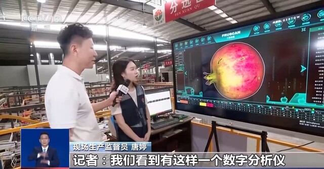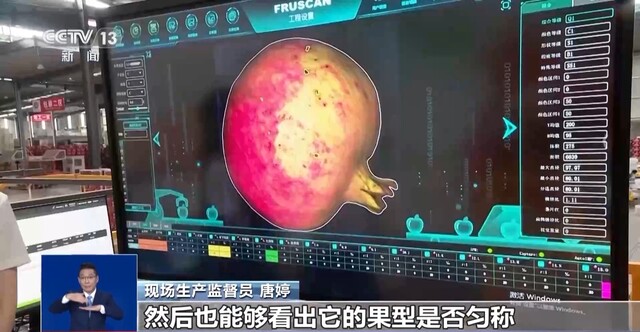 唐婷:我们使用高精度工业相机快速拍摄,能够准确检测出裂果、花纹、黑斑,也能看出它的果型是否匀称。第二步就是内部品质的无损扫描,通过红外线扫描技术,我们可以快速精准地检测出每个果子的糖度,糖度低于12度的果子会直接淘汰,同时也会监测果子内部是否存在黑变问题,保证每一颗石榴都是品质过硬的。