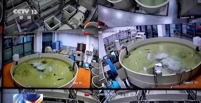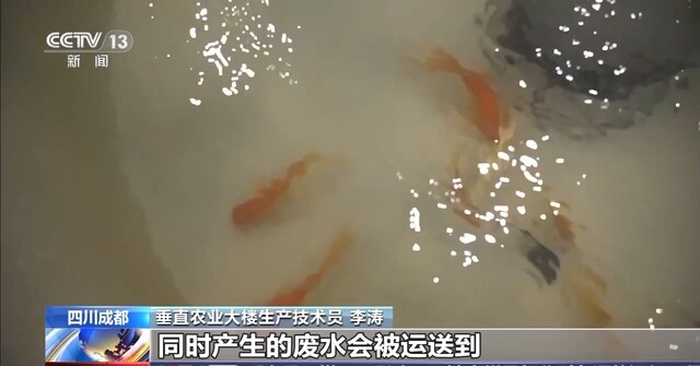 垂直农业大楼生产技术员 李涛:智能水循环养殖工厂配备了粪便收集、沉淀以及硝化反应等全流程系统,可以精准调节不同水产的需求。同时产生的废水会被运送到负一楼水肥中心,进行反应之后转化为营养液,再为一楼作物进行反哺。