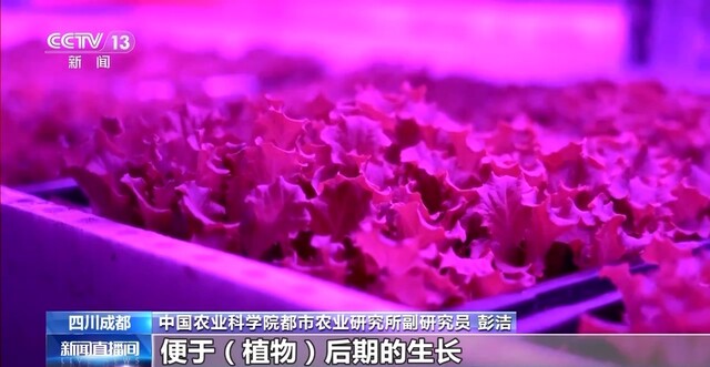 中国农业科学院都市农业研究所副研究员 彭洁:蓝光能让根系更发达,便于植物后期的生长。红光会促进作物的营养生长,让它长得更大更好。我们在不同的生长阶段,配比不同的光配方,那就能收获更多的产量。