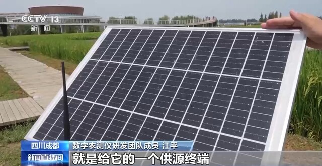 数字农测仪研发团队成员 江平:这台数字农测仪是我们自主研发的。太阳能电池板是它的供源终端。下面三条线,分别接了三个核心要素的数据采集终端,分别是土壤数据、环境数据、作物的冠层水分温湿度的数据。