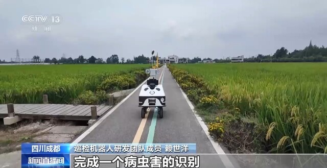 在四川成都新都区稻菜现代农业园区,4.19万亩水稻已经灌浆,进入籽粒充盈、养分积淀的最后冲刺阶段,由当地自主研发的农业巡检机器人已经代替人工,正在进行巡检工作。