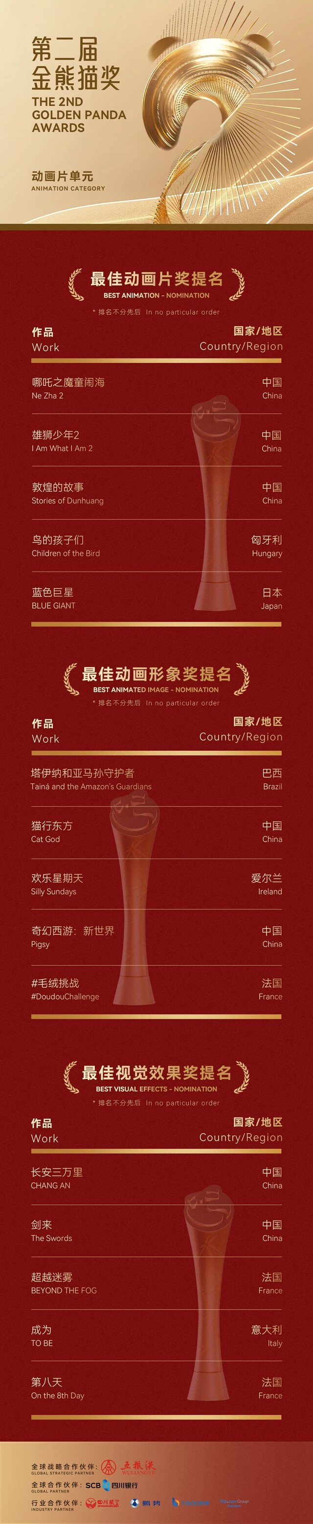 9月8日,第二届金熊猫奖提名名单公布,提名作品将竞逐电影、电视剧、纪录片、动画片、评委会特别奖五大类共27个奖项,获奖作品将在9月13日晚举行的金熊猫盛典上揭晓。