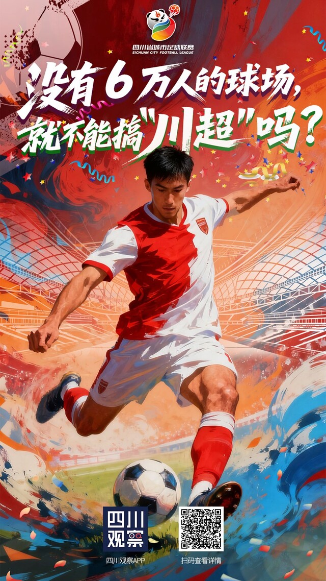 写到这里,再来问没有 6 万人的球场,能不能搞 “川超”?答案很清晰:从“苏超”的草根狂欢中,我们看到了足球的灵魂是热爱,场地从来不是障碍;从“川军精神”的传承中,我们感受到了体育的核心是意志,硬件远非关键;从“后发赶超”的路径中,我们明白了差距是动力,不足恰恰是进步的起点。
