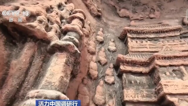 与此同时,文物数字化保护工作也在紧锣密鼓地开展中。在研究院里,记者看到一处特别的3D打印模型,它使用红砂岩材料制成,与山上自然本体的石窟质地完全相同。