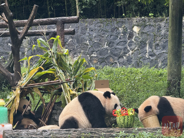 每年的7至9月,是这里大熊猫的集中繁育季,也是大熊猫的生日季。在现场,奶爸奶妈们为“叻叻”“鑫鑫一家”“苏阳”“蕊蕊一家”“春野”“秋野”“牧野”等大熊猫精心制作了各式丰容物品。例如,竹竿、竹叶、芭蕉叶组合而成的舒适大床,原本平平无奇的纸箱摇身一变成为旗袍和狮子形态,竹子祈愿树上挂满了果蔬和千纸鹤,还有玉米秆和葫芦制作的风铃。丰富多样的食物、认知、感知与环境丰容激发了大熊猫们的好奇心,它们兴奋探索、玩耍嬉戏。