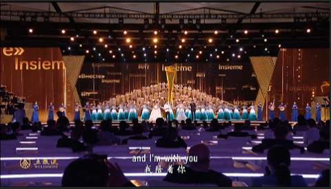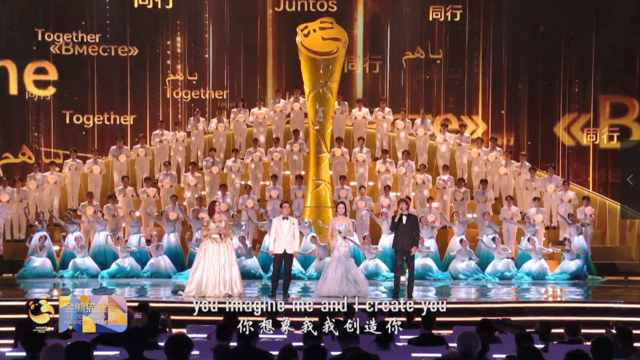 当副歌响起,“同行”的多语种字幕漂浮闪耀,音乐层层递进,管弦齐鸣与大合唱汇成情感洪流,金色灯光照亮全场,宛如一条象征“世界同行”的银河,完美诠释了金熊猫奖促进文明交流互鉴的宗旨。