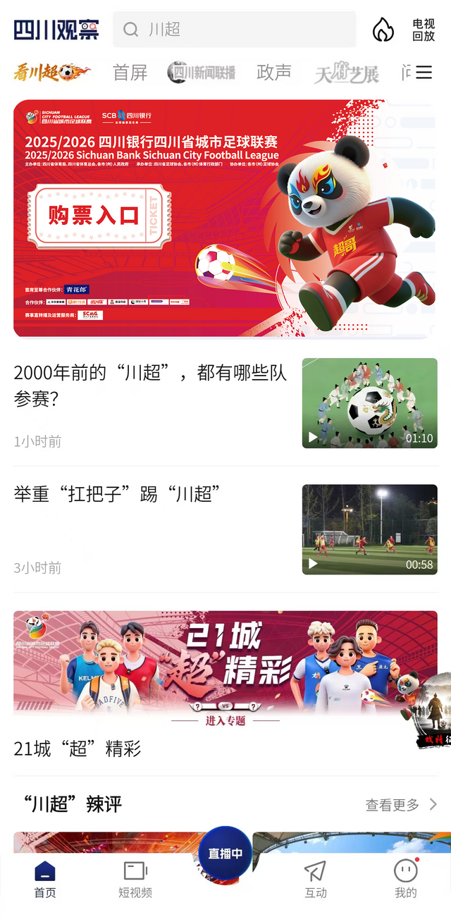 2、在四川观察首页点击“看川超”进入川超频道,点击进入购票入口。进入页面后,点击右上角个人中心先进行登录。