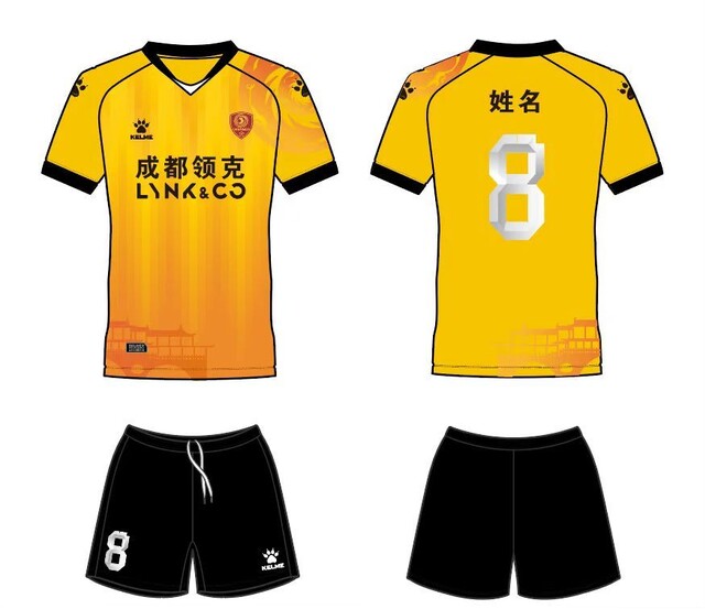 队服款式设计融合成都文化元素与现代足球风格,彰显城市精神:球队主场队服选用黄色为主色调,左肩印有太阳神鸟图腾、右下角呈现九眼桥投影,搭配黑色短裤。球队客场队服选用蓝色为主色调,为通用客场球服。