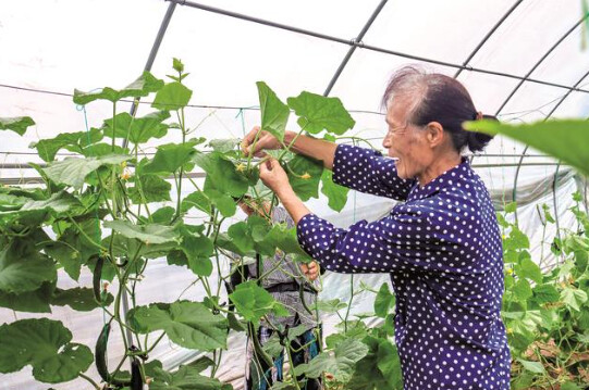 9月16日早晨6点,广安区浓溪镇全民村的蔬菜基地里,村民们早已忙碌开来,他们穿梭在藤蔓间,熟练地整理黄瓜藤条,既保证阳光穿透叶片促进光合作用,又避免藤蔓缠绕影响生长。