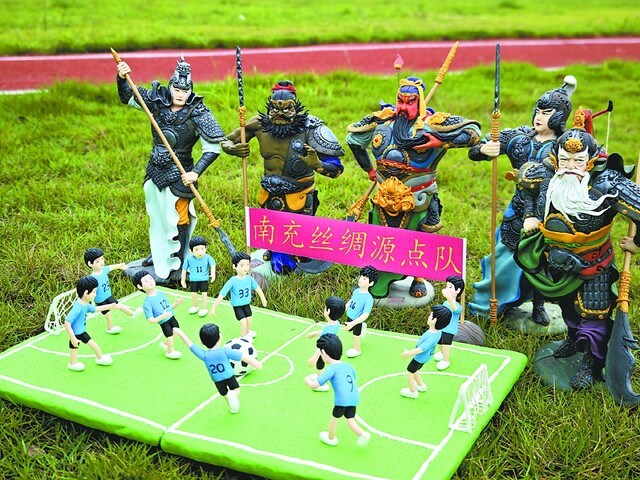 17日上午,记者来到多扶镇“王安斌泥塑工作室”。在他的工作台上,摆放着最新创作的“川超”作品:绿茵场上,11名足球队员姿态各异,神情专注,一旁的横幅写有“南充丝绸源点队”……整组作品色彩亮丽,人物形象栩栩如生,给人以激情和力量。