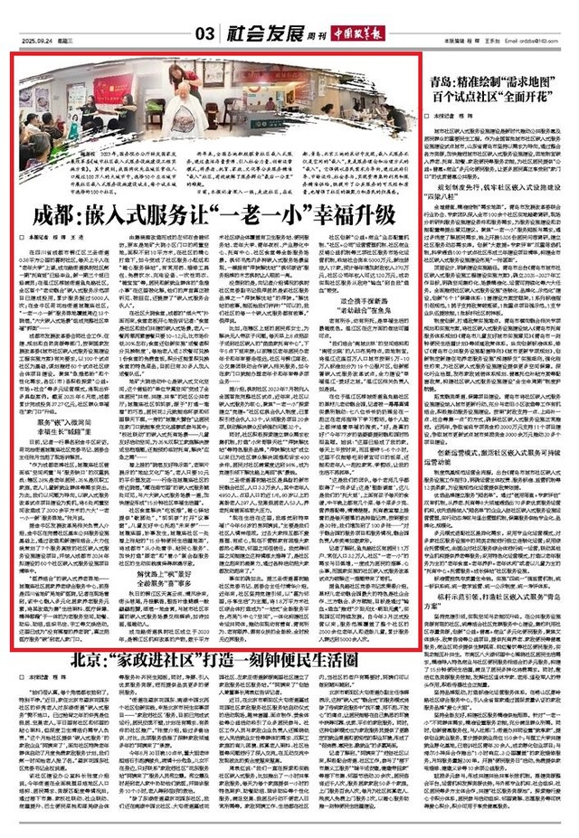 在四川省成都市锦江区三圣街道0.38平方公里的喜树社区,每天上千人在“老年大学”上课,成龙路街道枫树社区第一期“托育班”已经毕业,新一期三个班已经满员;在温江区柳城街道鱼凫路社区,全区首个“老幼融合”嵌入式服务示范项目已建成投用,累计服务超过5000人次;在金牛区荷花池街道城隍庙社区,“一老一小一新”服务阵地覆盖周边13个院落,“六大嵌入式场景”组成完整社区幸福“拼图”……
