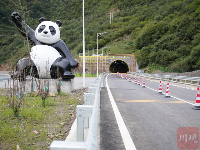 试跑时记者观察到,整条高速大熊猫“含量”极高,生态气息扑面而来。在白马隧道口,憨态可掬的大熊猫雕像坐在高速中间,举着手给过往车辆“打招呼”;平武互通出入口整体设计为大熊猫造型,与平武“天下大熊猫第一县”的称号对应。