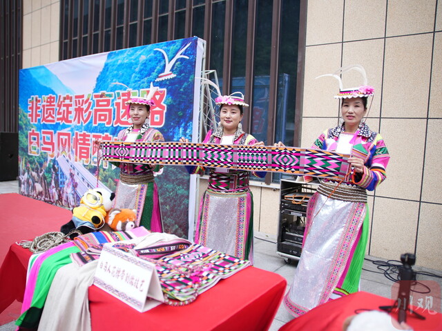 除了自然风光,文化体验也同样丰富。在平武县木座服务区,白马藏族文化元素随处可见,花腰带、白毡帽、曹盖面具……充满地域特色的产品,仿佛将白马藏族的古老生活场景生动再现。还有白马藏族民间舞团献演,以白羽毛头饰、白马藏族服饰为特色,搭配羊皮鼓等传统乐器现场伴奏,还原了白马人“火塘边的歌舞记忆”。
