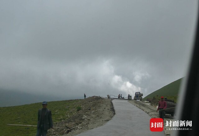 2007年8月8日,夹金山公路垭口附近,工作人员正在铺设水泥路面。摄影:杨涛