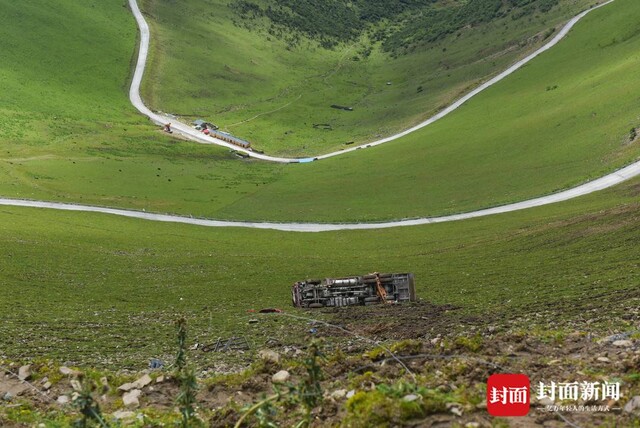 2019年7月26日,夹金山公路旁,一辆汽车滚下山岩。夹金山弯多路窄,经常有事故发生。摄影:杨涛
