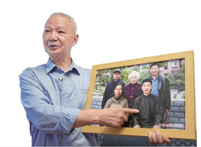 夏吉明拿着全家福,介绍父亲夏惠禄的生平事迹。