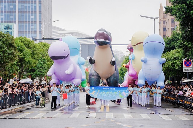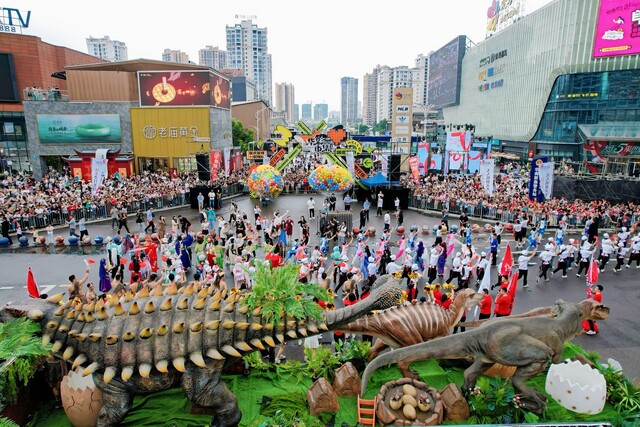 10月1日上午,自贡恐龙大巡游在华商举行。(自贡市委宣传部供图)