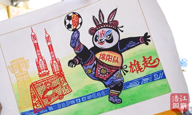 “你看,这个熊猫川超娃娃正在完成足球赛事中经典的倒挂金钩动作。”兰小奇指着作品中的熊猫形象介绍,“它头戴白马藏族头饰、身着羌族服饰,既体现四川多民族特色,又暗含‘足球无界’的寓意。背景里,火箭图案代表绵阳科技城,青铜面具元素象征三星堆文化,‘绵阳来吧’的书法字样则是向八方来客发出的邀请。”