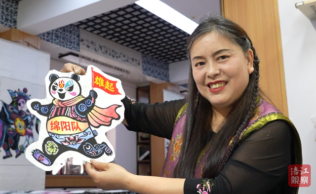 兰小奇是省级非遗“三台剪纸”的代表性传承人,她将脱稿剪纸技法与足球文化结合,在作品中融入川超联赛的标识元素和四川地方文化符号,展现了非遗艺术在体育赛事中的创新应用。