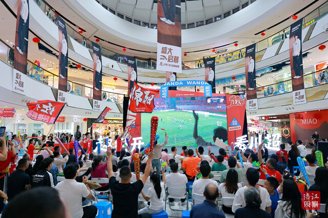 第二观赛点——乐荟城商业广场,实时转播赛况将氛围拉满,球迷们齐聚于此呐喊助威,现场热闹程度丝毫不输主场。