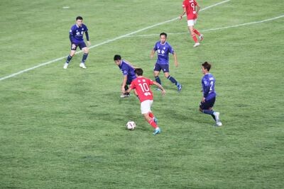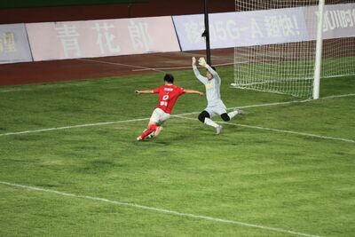 机会总会眷顾拼搏的人。雅安貊貊队在先失一球的情况下,依靠一个全力拼抢来的点球,由8号队长周波主罚一蹴而就,将比分追平。进球后,周波迅速捡起足球,招呼队友们继续战斗。