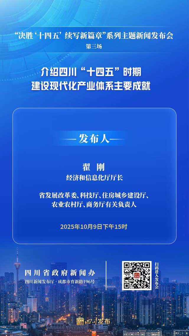 2025年10月9日(星期四)15:00,省政府新闻办将在四川新闻发布厅举行“决胜‘十四五’ 续写新篇章”系列主题新闻发布会第三场,经济和信息化厅厅长翟刚围绕四川“十四五”时期建设现代化产业体系主要成就作介绍并答记者问,省发展改革委、科技厅、住房城乡建设厅、农业农村厅、商务厅有关负责人参加并答记者问。四川发布客户端将全程图文直播,敬请关注!
