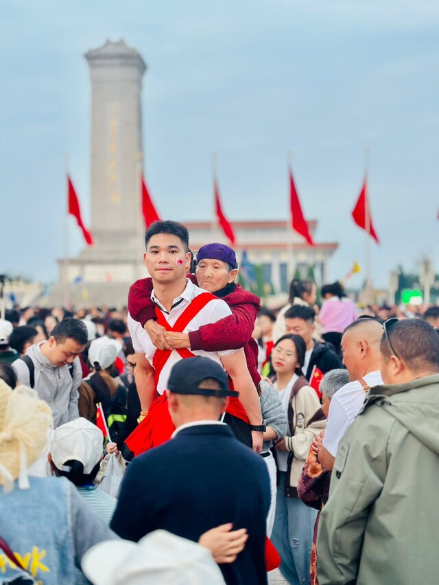 谭卫民背着母亲看天安门升旗仪式。