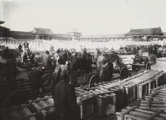 1933年从故宫太和门广场清运文物的场景 图据乐山故宫文物南迁历史研究院