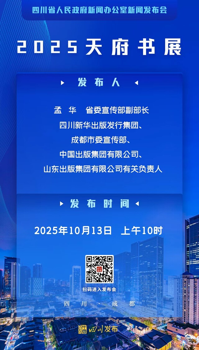 2025年10月13日(星期一)10:00,省政府新闻办将在四川新闻发布厅举行新闻发布会,省委宣传部副部长孟华介绍2025天府书展总体筹备情况,四川新华出版发行集团、成都市委宣传部、中国出版集团有限公司、山东出版集团有限公司有关负责人参加答记者问。四川发布客户端将全程图文直播,敬请关注!