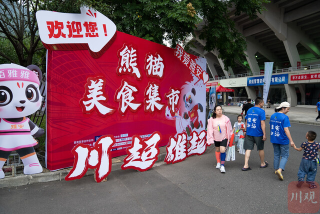 赛场内,比赛激战正酣。赛场外的美食集市里,也坐满了前来观赛的球迷和游客,大家一边看着电视机里的球赛转播,一边品尝着钵钵鸡、鲜榨果汁。“观赛之余,不少人也会选择到美食集市里来进行消费。”凌晓莉说。