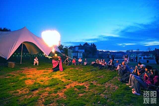 “没想到在稻田边能喝咖啡、看表演!”来自成都的游客李蓉在“帅府粮仓”的“秧咖啡”内,一边品尝桑椹生椰拿铁,一边细细感受乡村的温柔肌理。窗外,稻浪随风起伏,“鱼鳞坝”水声潺潺;室内,咖啡的香甜与乡土竹艺装饰相映成趣。