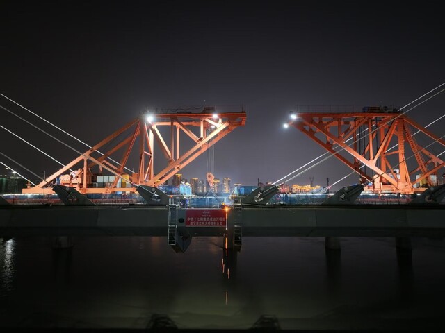 据中铁十七局成达万高铁项目二工区总工程师单立国介绍,最后吊装的钢箱梁总重达58.8吨。由于大桥横跨涪江,施工团队创新采用“浮运+桥面吊装”方案,先将钢箱梁通过浮箱从码头运输至江心指定位置,再运用150吨桥面吊机进行精准提升。为确保合龙精准可控,项目团队提前谋划、周密部署。针对大跨度斜拉桥合龙段受力复杂、温度变形敏感、精度控制要求高等技术难点,团队选择夜间“温度低、温差小”时段进行合龙,有效减少温度变化引起的结构变形,并通过线形监控、劲性锁定等关键技术措施,最终将线形精度控制在毫米级范围,实现高质量合龙。