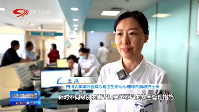 四川大学华西医院心理卫生中心心理综合病房护士长 王凤:针对不同级别的患者也给予不同的安全管理措施,从入院到出院、连续的动态的安全管理、危险物品管理、药品的管理,包括家属和患者的健康宣教等等都融入在我们的安全管理中。