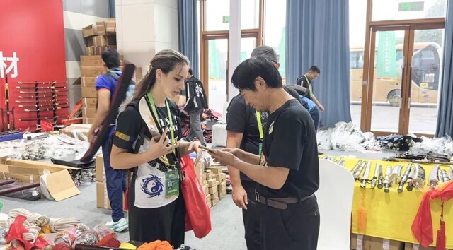外籍游客在体育文化旅游商品展销区购买中国武术兵器文创产品