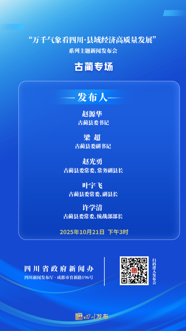 2025年10月21日(星期二)15:00,省政府新闻办将在四川新闻发布厅举行“万千气象看四川·县域经济高质量发展”系列主题新闻发布会古蔺专场,古蔺县委书记赵源华将围绕“‘抓特色、扬优势’革命老区县域经济高质量发展蝶变”作介绍并答记者问,古蔺县委副书记梁超,古蔺县委常委、常务副县长赵光勇,古蔺县委常委、副县长叶宇飞,古蔺县委常委、统战部部长许学清答记者问。四川发布客户端将全程图文直播,敬请关注!