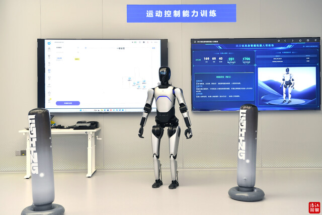 从行动灵活地在路面巡逻,到随着音乐节拍动感起舞;从应答自如地对话,再到稳定地将各种物品放到对应的置物筐中……10月20日,记者走进四川省具身智能机器人训练场,看到各式各样的机器人大显神通,仿佛进入了一个科幻的世界。